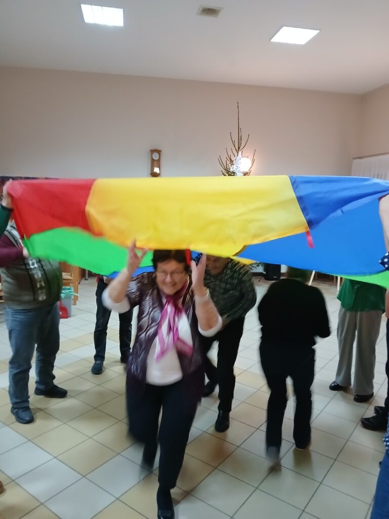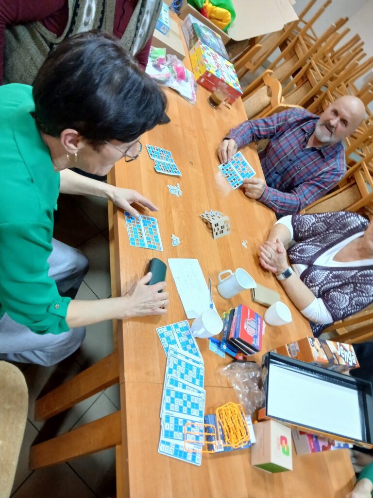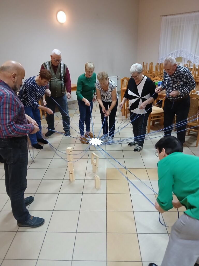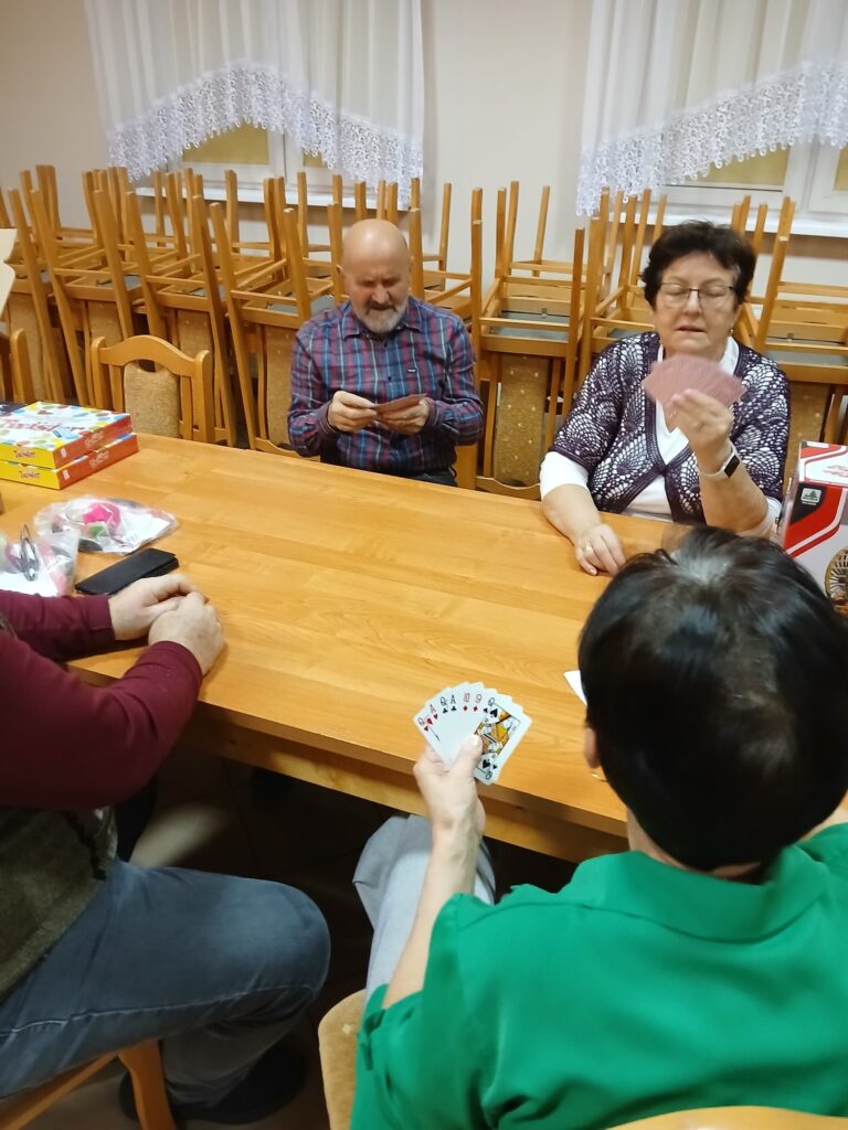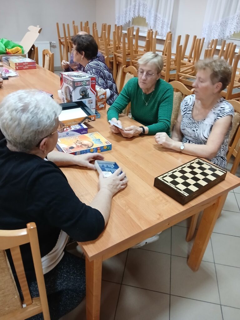 ,,Spotkanie przy kawie”: spotkanie z grami i zabawami dla seniorów – część integracyjna obejmowała różnorodne gry i zabawy, które wspierały aktywizację umysłową i fizyczną seniorów. Wspólna rozrywka sprzyjała budowaniu relacji, wzmacnianiu więzi oraz kształtowaniu pozytywnej atmosfery w grupie.