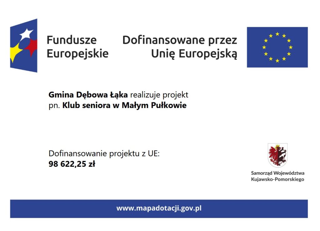 Gmina Dębowa Łąka wraz z Gminnym Ośrodkiem Pomocy Społecznej w Dębowej Łące zapraszają mieszkańców z terenu gminy Dębowa Łąka, którzy ukończyli 60 rok życia, do uczestnictwa w projekcie objętym grantem pt. „Klub seniora w Małym Pukowie” w ramach Programu Fundusze Europejskie dla Kujaw i Pomorza 2021-2027 współfinansowanego ze środków Europejskiego Funduszu Społecznego Plus, Priorytetu 7. Fundusze europejskie na rozwój lokalny, w ramach Działania FEKP.07.04 Wspieranie integracji społecznej.