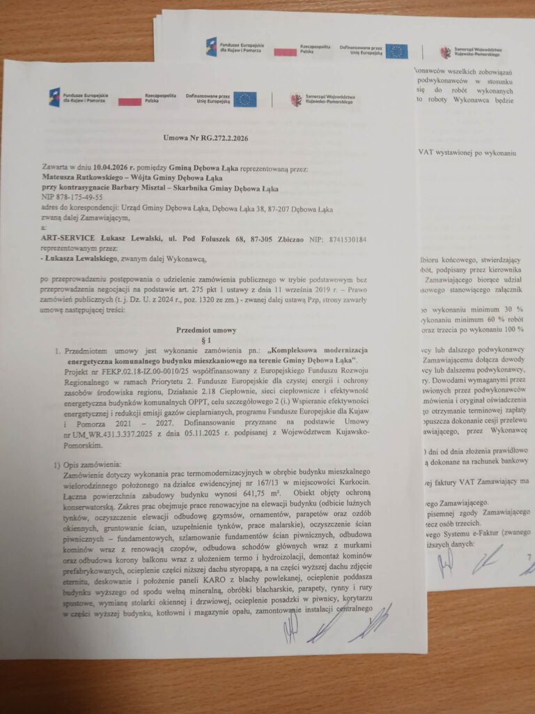 W dniu 17 listopada 2025r. Wójt Gminy Dębowa Łąka Mateusz Rutkowski odebrał umowę na dofinansowanie projektu pn. ,,Kompleksowa modernizacja energetyczna komunalnego budynku mieszkaniowego na terenie Gminy Dębowa Łąka”.