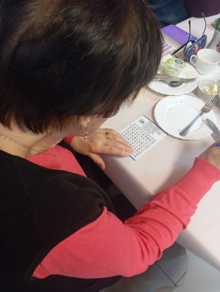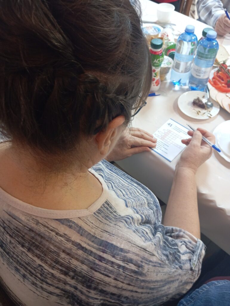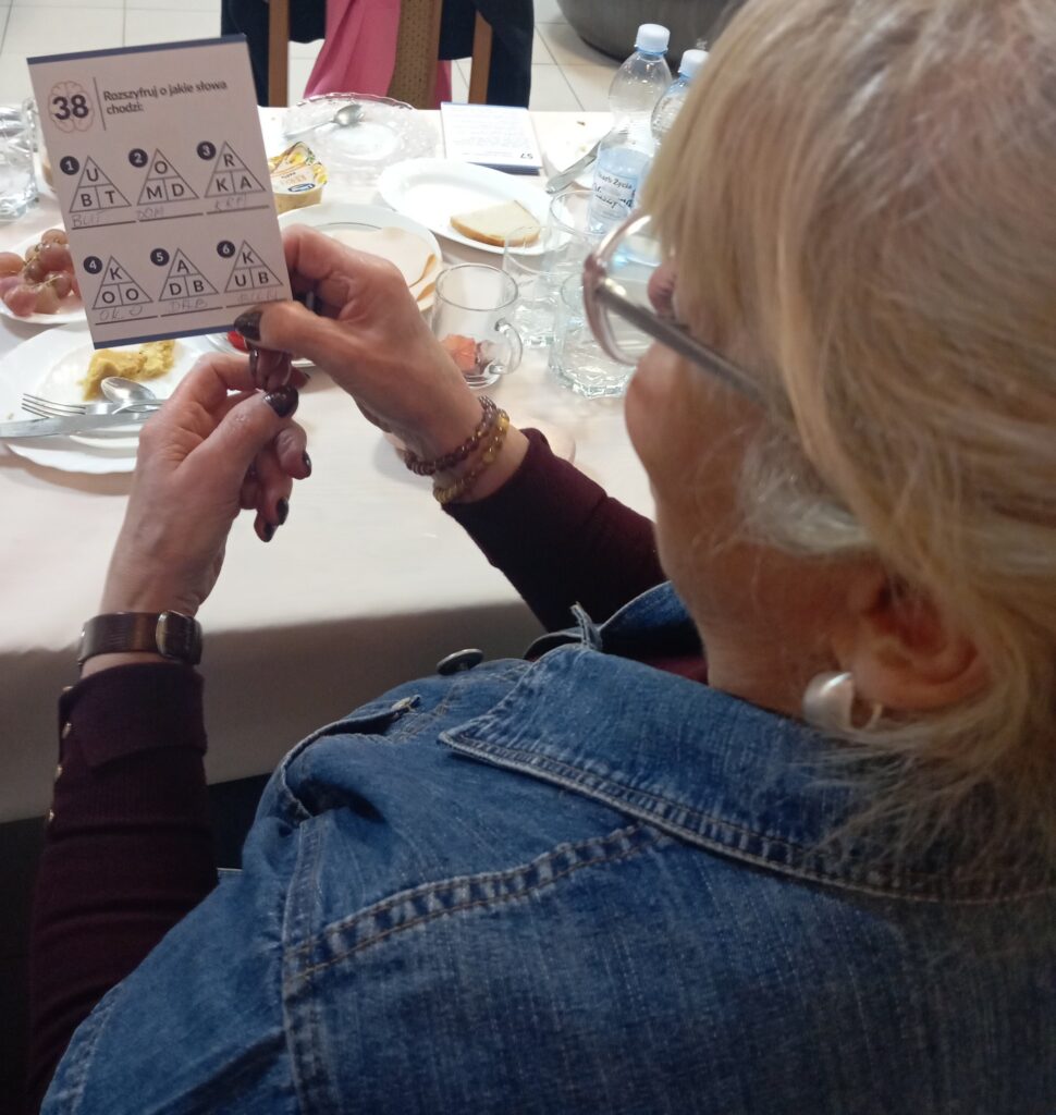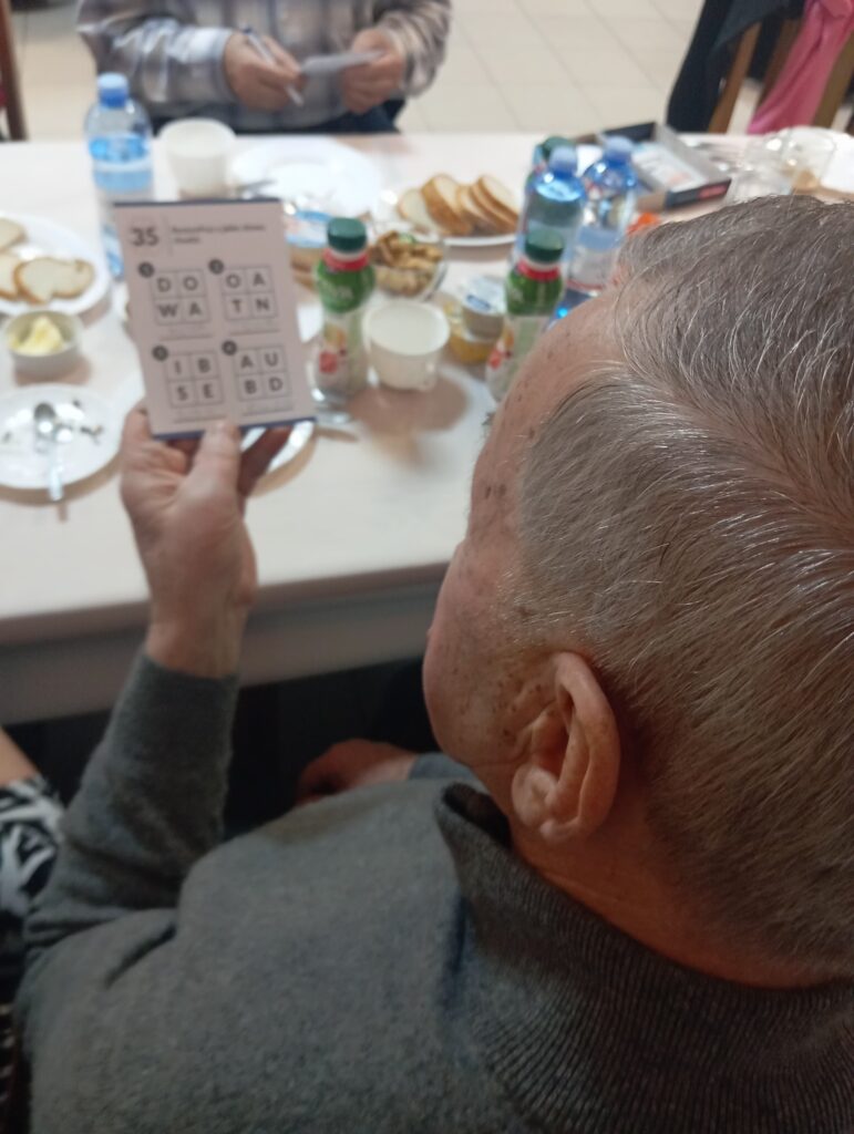 Następnie seniorzy mogli skorzystać z mnogości gier planszowych zakupionych w ramach projektu. Dzisiejszy wybór padł na „Grę dla seniora – logiczne myślenie”. Gra, która polegała na zapamiętywaniu szczegółów, porównaniu lub odnajdywaniu określonych elementów wymagała od naszych seniorów zarówno skupienia, jak i spostrzegawczości ![]()